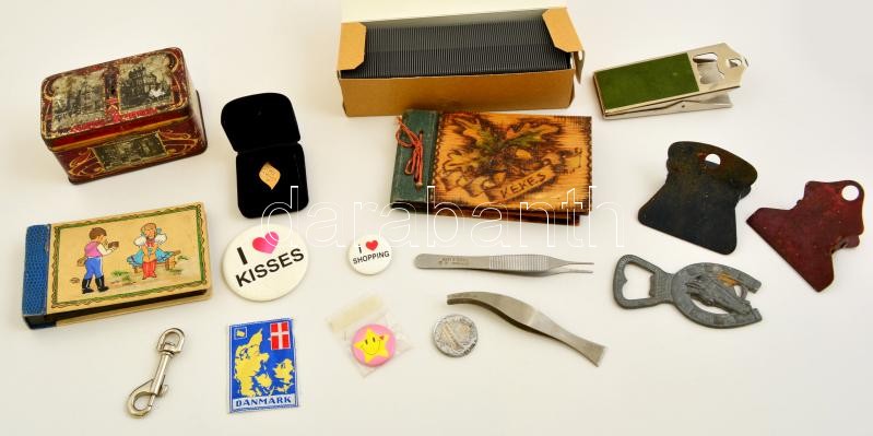 Beschreibung: Vegyes bolha tétel, közte, csipeszek, kisméretű albumok, régi fém dobozka, diakeret, kitűzők