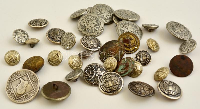 Beschreibung: Vegyes gomb tétel, benne egy Ferenc József 30 krajcárost mintázó gomb, tengerész gomb, stb., 38 db