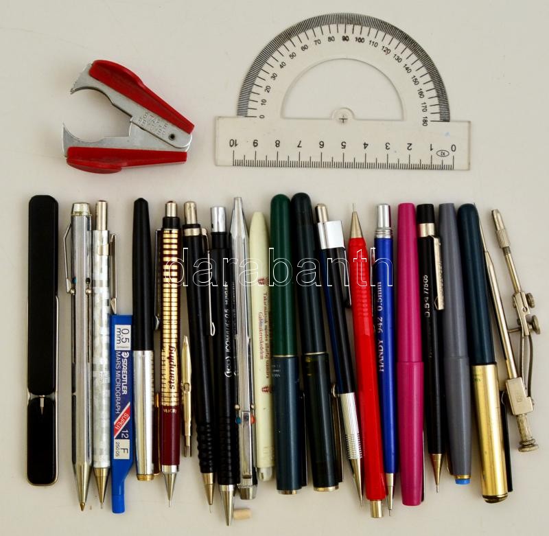 Beschreibung: Vegyes írószer tétel, köztük tollak, körző, töltőceruza, stb. összesen 22 db