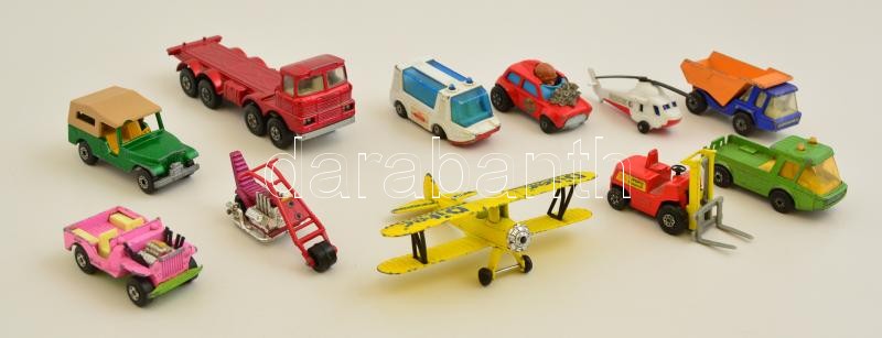 Beschreibung: cca 1970 11 db angol gyártású Matchbox játékautó, repülő, helikopter, motor, vegyes állapotban, különböző méretben