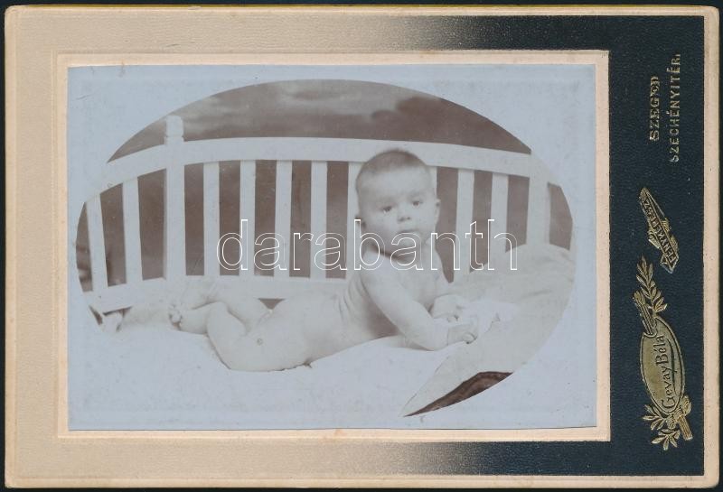Beschreibung: 1912 Győr, Baba műtermi fotója, keményhátú fotó Gevay Béla műterméből, hátoldalon a műterem képével, 13x10 cm
