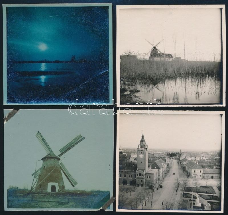 1930 Kiskunhalas, városkép, szélmalom, 4 fotó, sarkokon hibával, 6x6 cm / Kiskunhalas, Hungary, cityscape, windmill, 4 photos, with faults, 6x6 cm