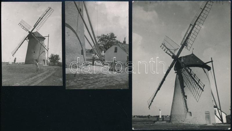 1936 Kiskunfélegyháza határában levő szélmalom, 3 db vintage fotó Kerny István (1879-1963) budapesti fotóművész hagyatékából, kettő feliratozva, 7,4x5,3 cm és 11,5x8,5 cm között