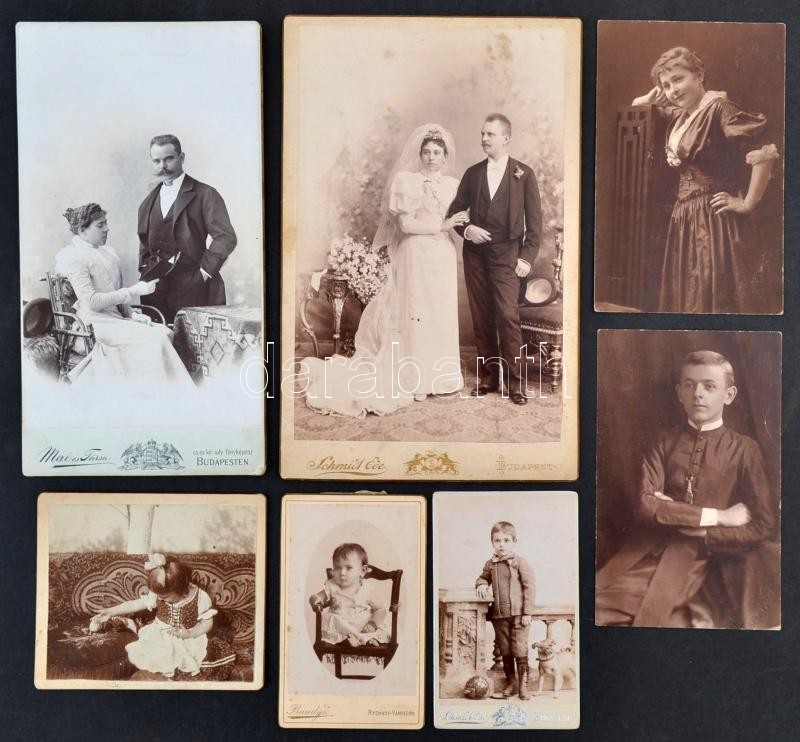 Vegyes fotó tétel, 7 db, keményhátú fotók, és két fotólap, a keményhátú fotók között 2 db Bp., Schmidt Ede,és 1 db Bp., Mai és Társa fotóval, 21x13 cm és 10x6 cm közötti méretben.