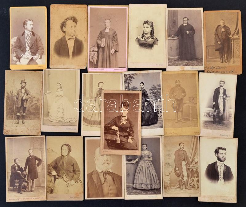 cca 1860-1890 Vegyes keményhátú portréfotó tétel, 19 db, közte nevesített személyek fotóival,(közte: dr. Osztoics Mihály (1838-1912) városi bíró, Buda utolsó rendőrfőkapitánya), különféle műtermekből (Klösz György, Borsos József, Szentkuty István (2 db), Ganzi és Heller, Csonka Simon,(Pest), Th. Schimandl, Drescher, (Arad), Ciehulski P. (Marosvásárhely), Meinhardt és Császár (Kolozsvár), Bottlik M. (Szabadka), Jacob Adler (Pozsony), Juwelier Nándor (Selmec), Lengyel Samu (Kassa), Klein Márk (Ungvár), Mayer és Bietler (Szeged), Schmidt V. (Székesfehérvár), M. L. Winter (Prága), változó állapotban, 11x6 cm és 10x6 cm közötti méretben.
