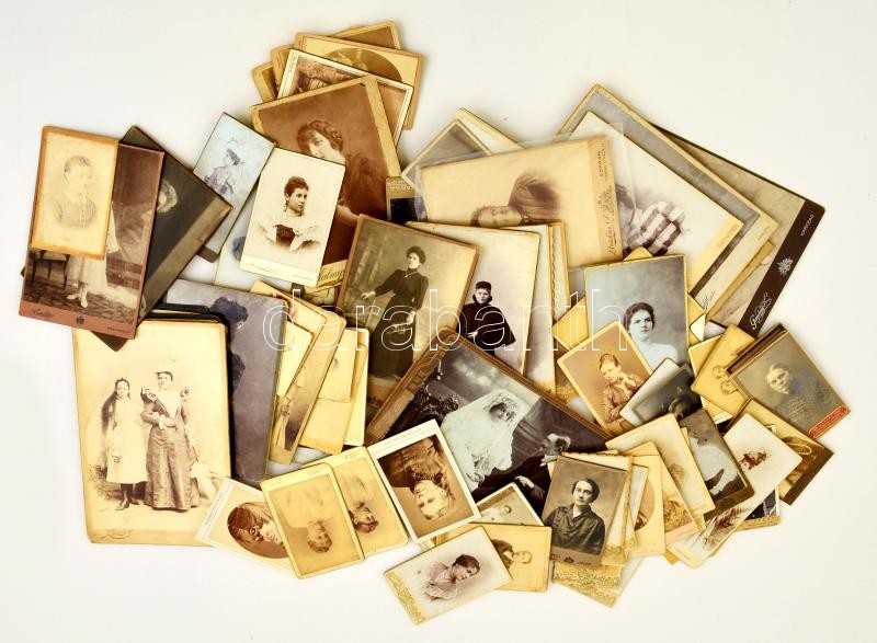 cca 1860-1900 Vegyes keményhátú fotó tétel, többségében nÅ‘i portrékkal, kb. 80 db, közte három Klösz Gy. fotóval, valamint fotókkal Goszleth Istvántól (7 db) és Doctor és Kozmatától (1 db), felvidéki (Anner József (Besztercebánya), Halmy J. Béla. (Losonc és Szliács), Föltényi Béla (LÅ‘cse-Tátrafüred), Hegedüs (Rózsahegy), Goller J. (Nagytapolcsány) (1-1 db), Kemény (Kassa, 2 db)) és erdélyi (Csillagi és Rutkai(Arad, 1 db), Kató József (Kolozsvár, 1 db) Fekete Sándor (Nagyvárad, 2 db), Hess és Kossák (Temesvár, 2 db)) fényképészek fotóival, valamint más fényképészek (Budapest, Csorna, NyÃregyháza, Sopron, Kecskemét, ..stb) fotóival, változó állapotban, 21x13 cm és 10x6 cm közötti méretben.