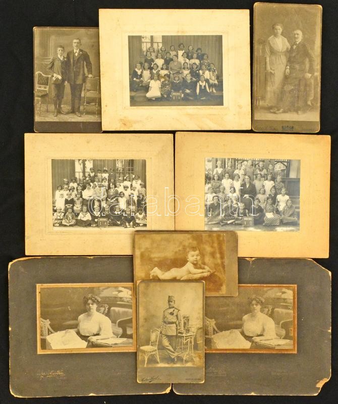cca 1900 Vegyes fotó tétel, 10 db, köztük katona műtermi portréja, iskolai csoportkép, műtermi portrék, kartonra kasírozva, 9,5x14 cm és 11x14 cm közti méretben