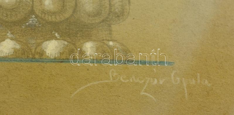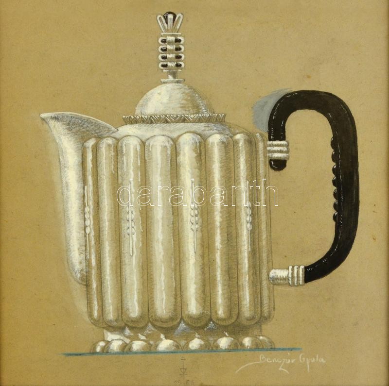 Beschreibung: Benczúr jelzéssel: Kiöntő. Vegyes technika, papír, üvegezett keretben, 26×25 cm