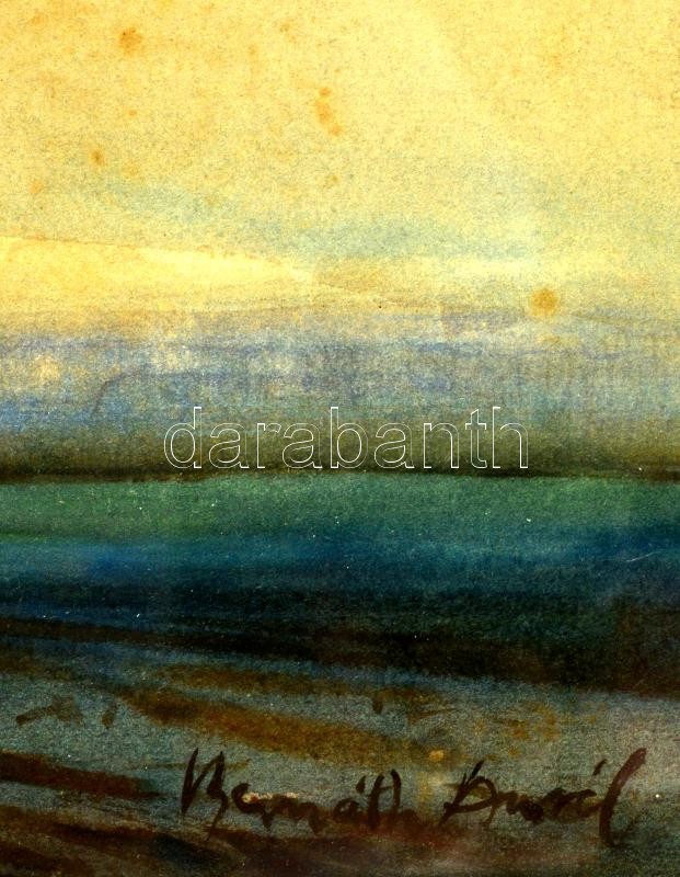 Beschreibung: Bernáth jelzéssel: Alföldi táj faluval. Akvarell, papír, üvegezett keretben, 26×39 cm