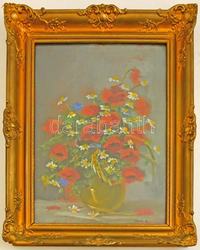 Beschreibung: Bíró Lajos (1927-2010): Virágcsendélet. Olaj, karton, jelzett, üvegezett keretben, 51×36 cm