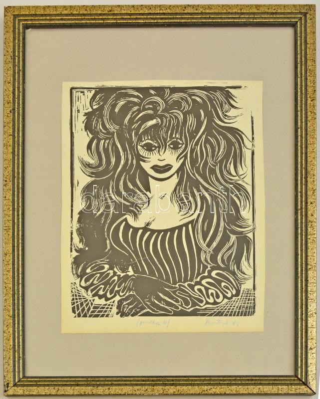 Beschreibung: Bortnyik Sándor (1893-1976): Próba II, női portré, linó, papír, utólagos jelzéssel, kartonra ragasztva, üvegezett keretben, 26.5×19.5 cm