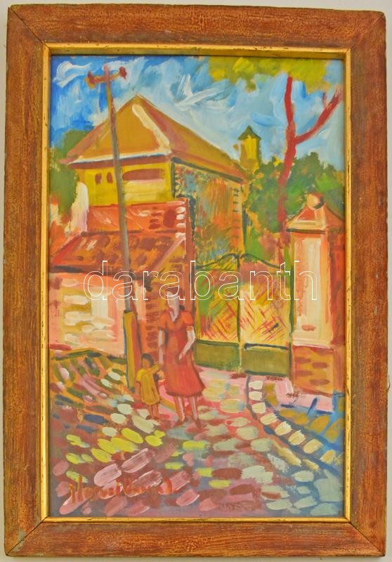 Beschreibung: Ilosvai jelzéssel: Utca részlet. Olaj, karton, üvegezett keretben, 55×36 cm