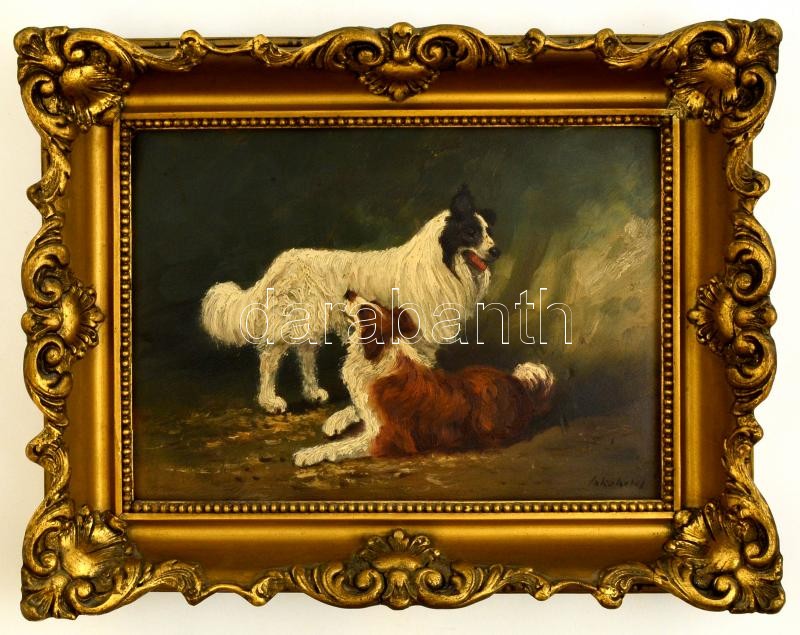 Beschreibung: Jakubetz jelzéssel: Kutyák, olaj, falemez, fa keretben, 24×34 cm