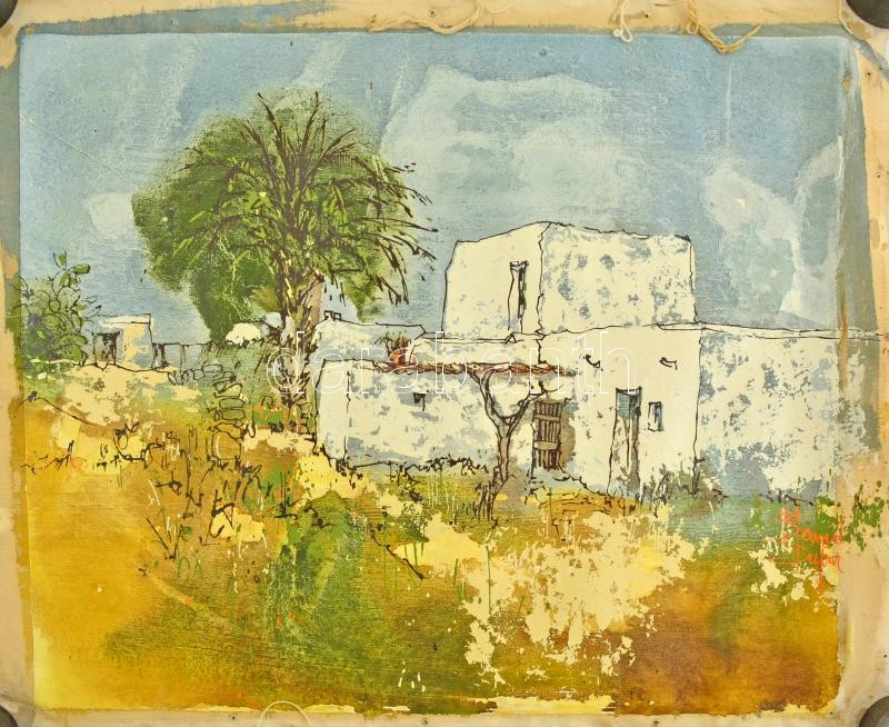 Beschreibung: Olvashatatlan jelzéssel: Ház pálmafákkal. Vegyes technika, vászon, felcsavarva, 38×44 cm