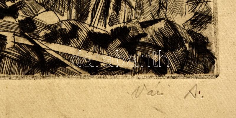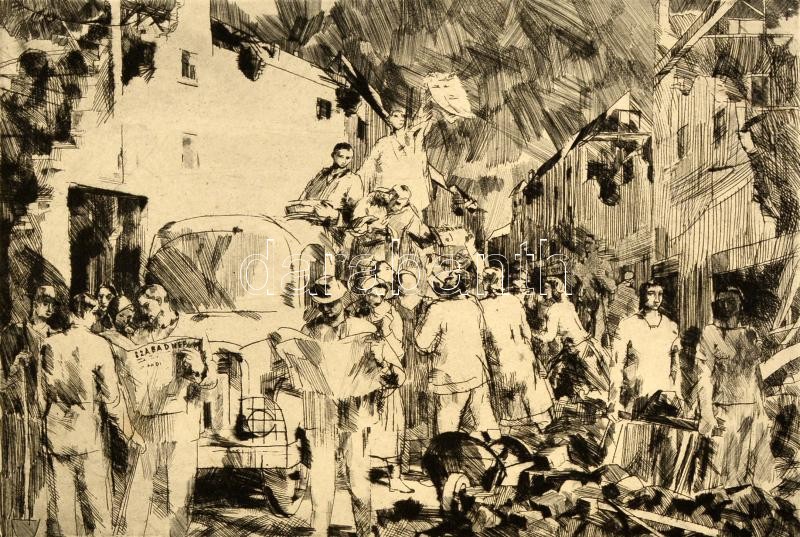Beschreibung: Váci András (1928-1989): Megjelent a Szabad Nép. Rézkarc, papír, jelzett, 21×30 cm