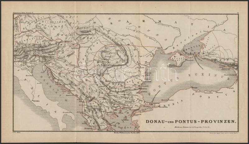 1885 Donau- und Pontus-Provinzen, a Római Birodalom Duna és Fekete-tenger vidéki provinciáinak térképe, rajta a Kárpát-Medencével, Mommsen Római történelem c. könyvéből, Berlin, Weidmannsche Buchhandlung-ny., 17x32 cm.