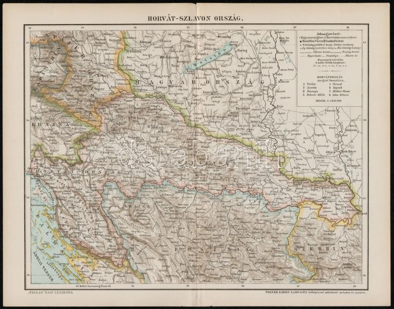Beschreibung: cca 1910 Horvát-Szlavón ország térképe, Posner Károly Lajos és Fia térképészeti műintézete, Pallas Nagy Lexikona, 24x30 cm