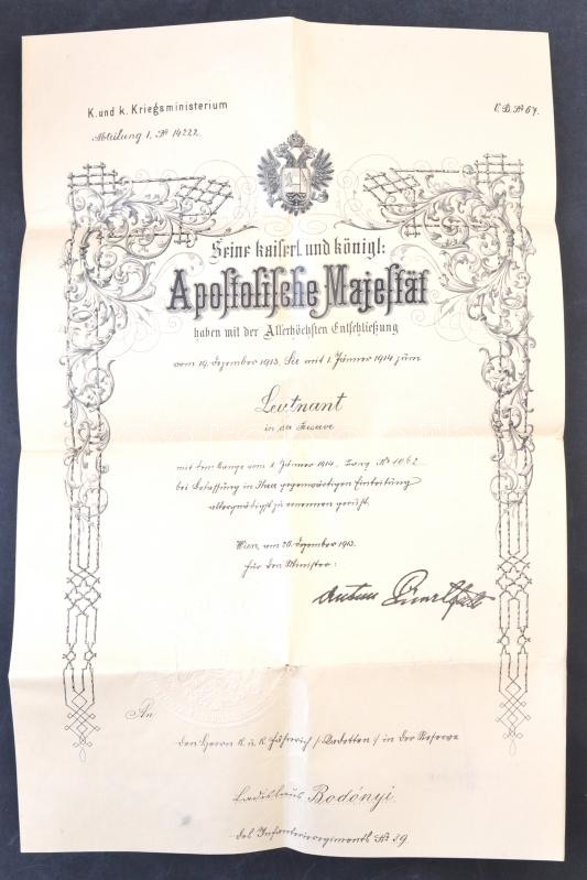1914 Díszes tartalékos hadnagyi kinevezés, a cs. és kir. báró Hötzendorfi Konrád Ferenc tábornagy debreceni 39. gyalogezred katonájának szóló kinevezés, díszes szárazpecséttel, aláírással