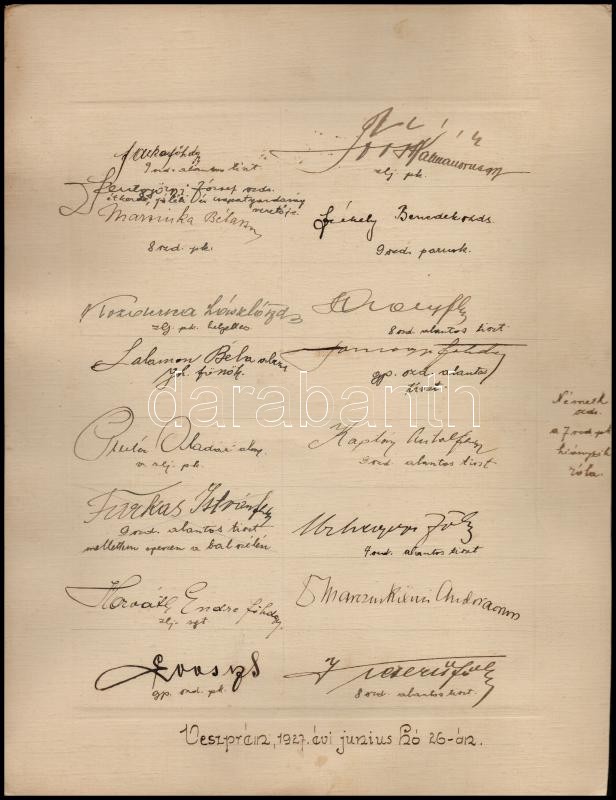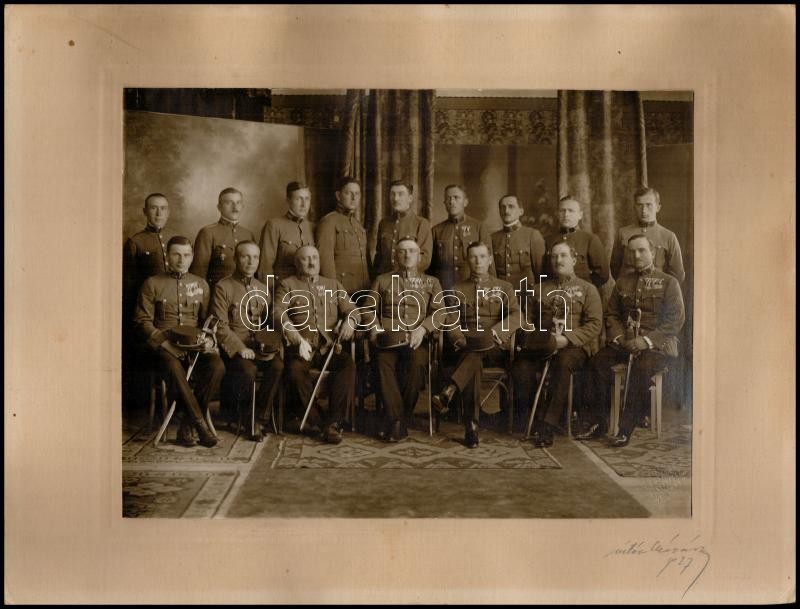 1927 Veszprém, Katonatisztek csoportképe, nem azonosított ezred harmadik zászlóaljának tisztjei, hátoldalán a képen szereplők aláírásai és rendfokozatai, köztük: Szentgyörgyi József százados, Székely Benedek százados, Salamon Béla alezredes, Pintér Sándor alezredes, Kapitány Antal, Horváth Endre főhadnagy. Vitéz Mészáros műterméből, kartonra kasírozva, 17x22,5 cm
