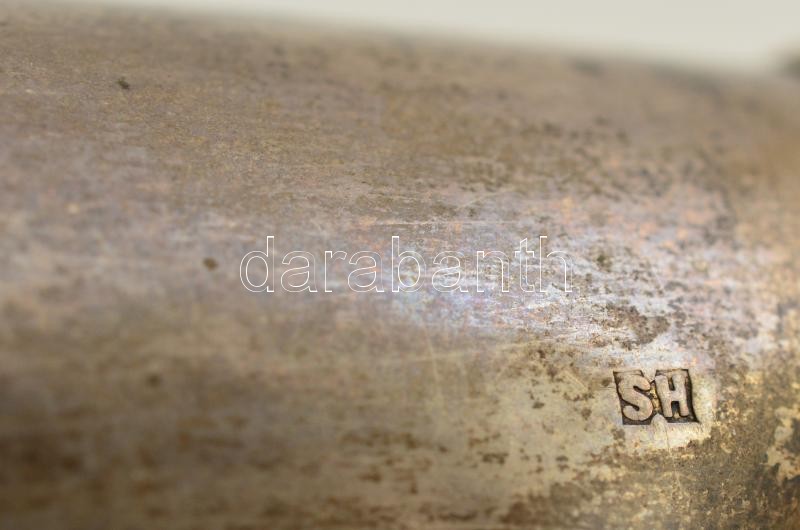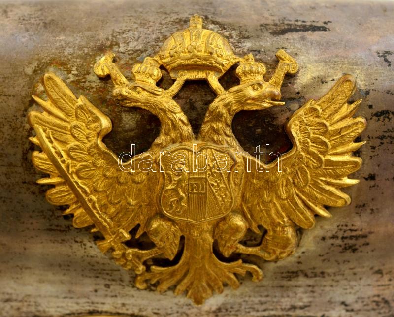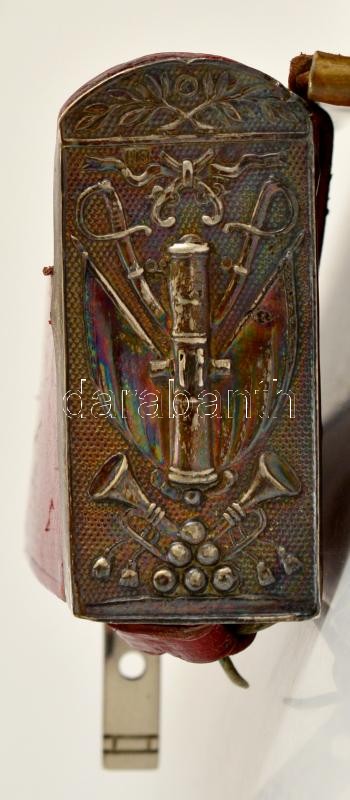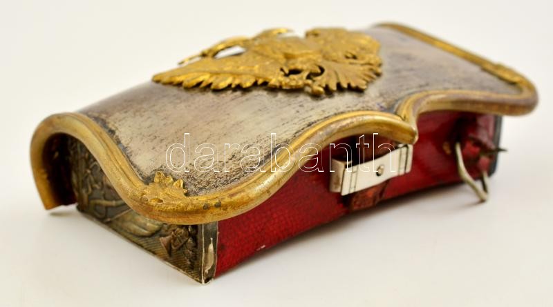 cca 1880 Vállszíjas tiszti tölténytáska, fa tok piros bőr borítással, oldalán ezüst fedlappal (jelzett, mesterjeggyel SH), veretek, fedelén patent rögzítésű aranyozott osztrák császári címer, kopott bőr, 15×9 cm