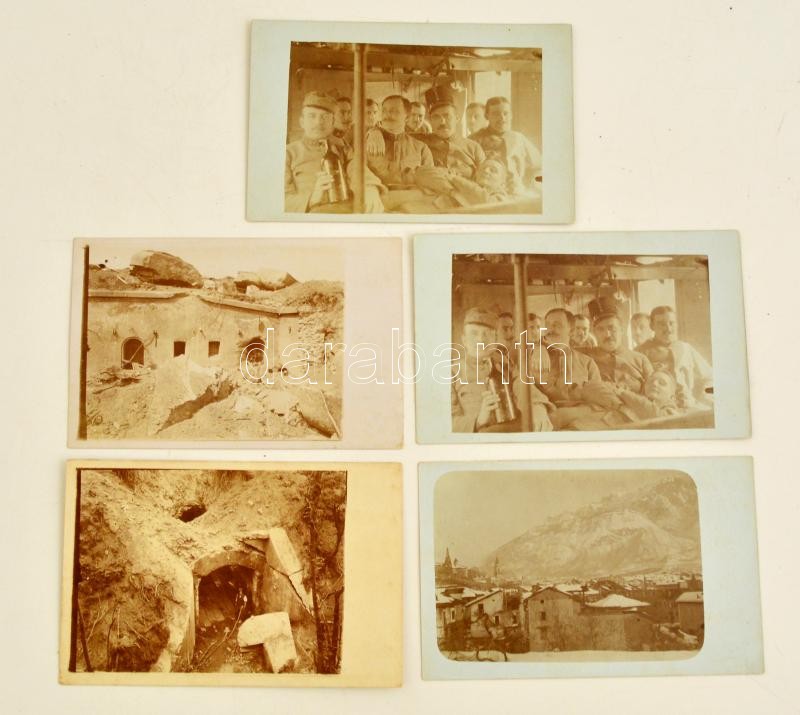 Beschreibung: cca 1916 Doberdó környéki lövészrákok és katonai fotók. Összesen 5 db