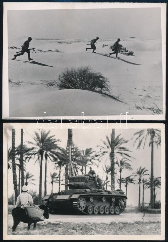 Beschreibung: cca 1941-1943 Német Afrikahadtest fotói, 2 db, az egyiken sivatagban rohamozó gyalogosokkal, a másikon német páncélossal, későbbi előhívás, 13x18 cm.