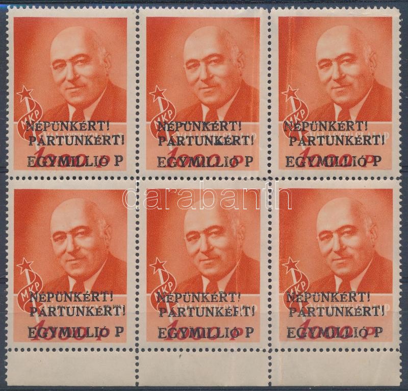 1952 Rákosi MKP propaganda bélyeg ívszéli hatostömb egymillióP felülny... https://www.darabanth.com/de/311-Fernauktion/311.0/Andere-Sammelgebiete/Paraphilatelie~300014/1952-Rakosi-MKP-propaganda-belyeg-ivszeli-hatostomb-egymillioP-felulnyomassal-gyurodesek~II1700420