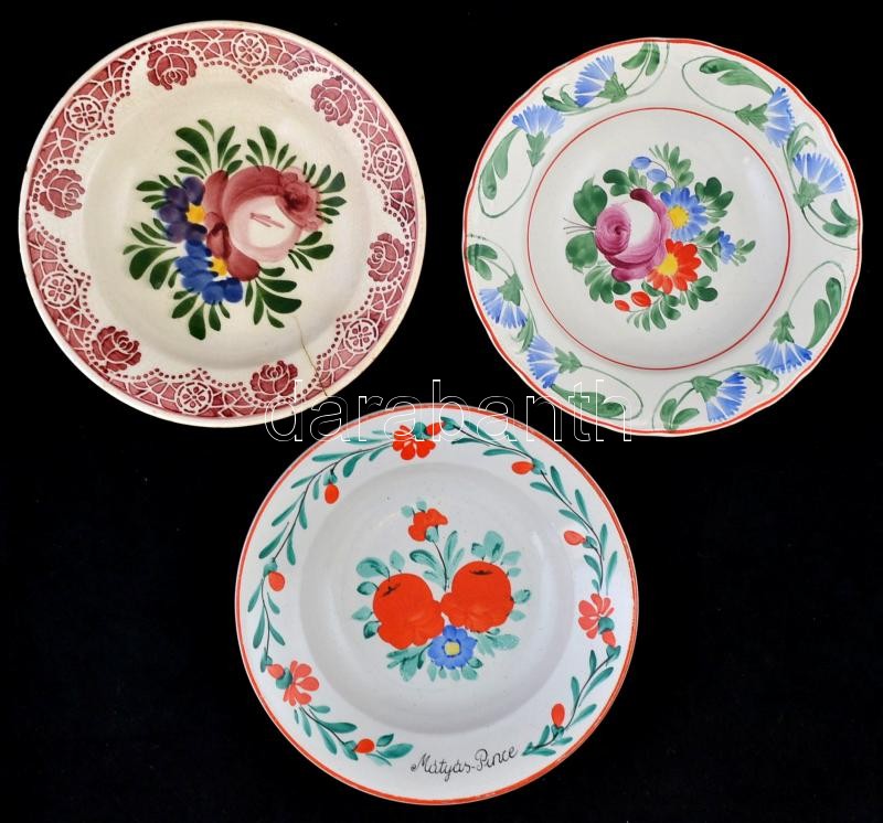 Beschreibung: 3 db porcelán falitányér és dísztányér, kézzel festettek, jelzettek (Zsolnay, Hollóházi Szakmáry) egyiken Mátyás-Pince felirat, egyikük repedt, d: 24 cm