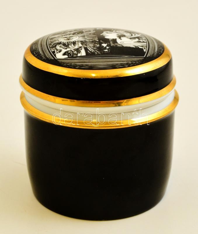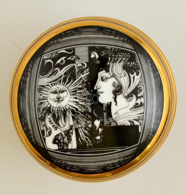 Beschreibung: Hollóházi Szász Endre által tervezett mintával díszített porcelán doboz, jelzett, kopásnyomokkal, m: 9 cm, d: 8 cm