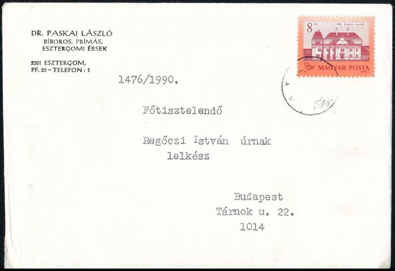 1990 Paskai László (1927-2015) ferences szerzetes, esztergomi (1987-1993), majd esztergom-budapesti érsek (1993-2002), bíboros aláírása egy köszönő levélen, pecséttel.