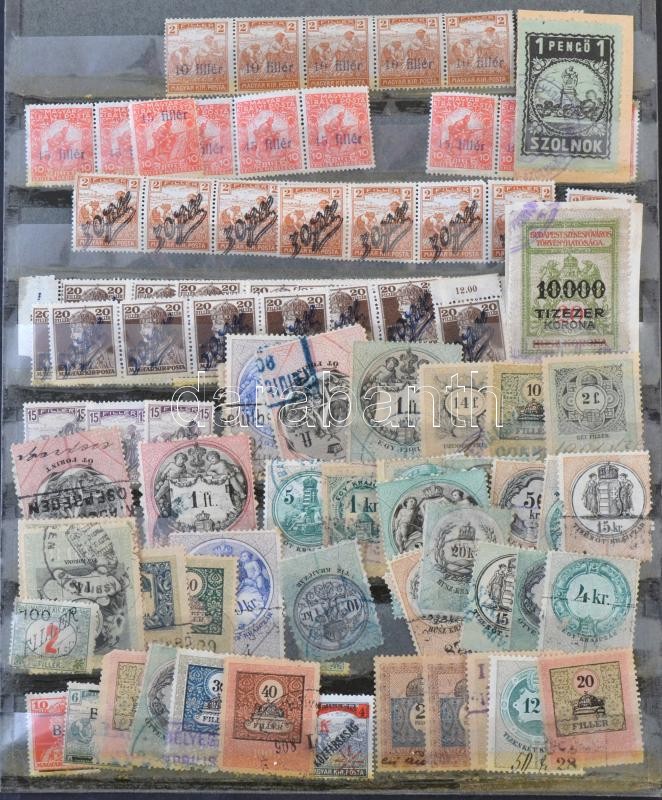 Beschreibung: Néhány száz vegyes magyar okmánybélyeg + kb 40 megsztállási bélyeg 5 berakó lapon + közepes berakóban