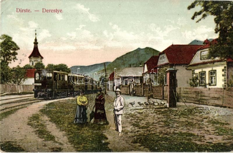 Beschreibung: Derestye, Darste (Brassó, Kronstadt, Brasov); városi vasút, gőzmozdony, üzlet / urban railway, locomotive, shop (EK)