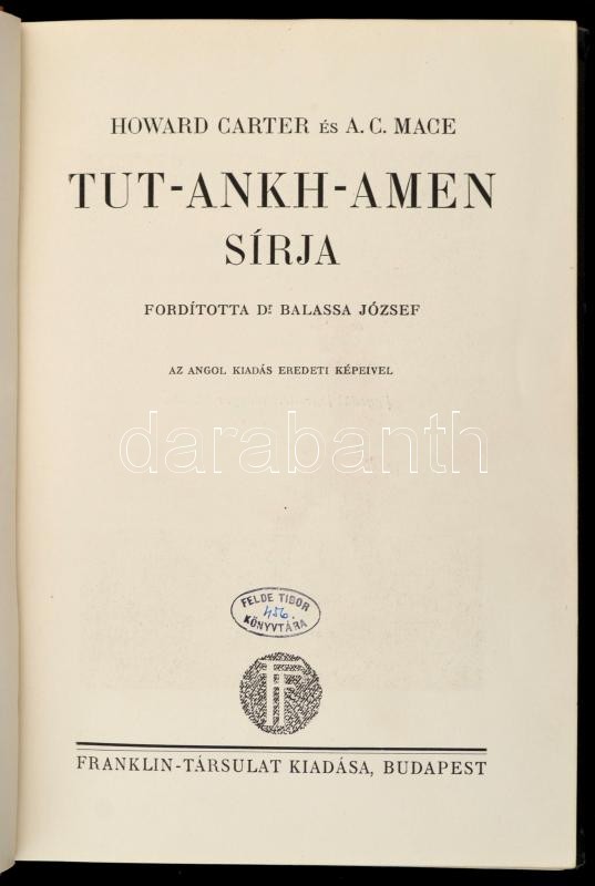 Howard Carter-A.C. Mage: Tut-ankh-amen sírja. Fordította Dr. Balassa József. Bp., én., Franklin-Társulat. Fekete-fehér fotókkal illusztrálva. Kiadói díszes aranyozott félvászon-kötésben, a könyv sarkai kopottak, egyébként jó állapotban.