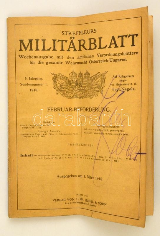 1918 Streffleurs Militärblatt. 5. évf. Nr. 36. 1918. március. Wien, 19... https://www.darabanth.com/de/311-Fernauktion/311.0/Bucher/Bucher-Militaria~300033/1918-Streffleurs-Militarblatt-5-evf-Nr-36-1918-marcius-Wien-1918-LW-SeidelSohn-KiadC3~II1698435