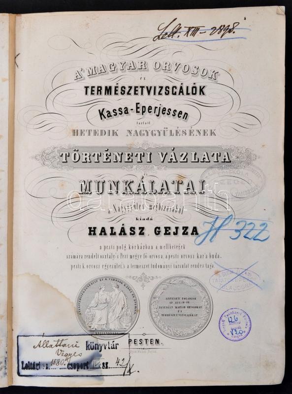 A magyar orvosok és természetvizsgálók Kassa-Eperjesen tartott hetedik nagygyűlésének történeti vázlata és munkálatai a Nagygyűlés megbízásából kiadta Halász Gejza. Pest, 1847. Kötéstábla nélkül, megviselt állapotban.