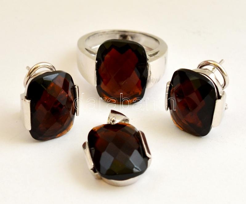 Beschreibung: Ezüst(Ag) barna köves szett, fülbevalópár + gyűrű + függő, méret: 56, jelzett, bruttó: 17,9 g