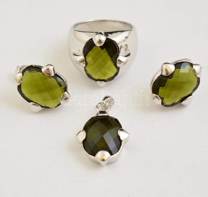Beschreibung: Ezüst(Ag) zöld köves szett, fülbevalópár + függő + gyűrű, jelzett, méret: 54, bruttó: 16,1 g
