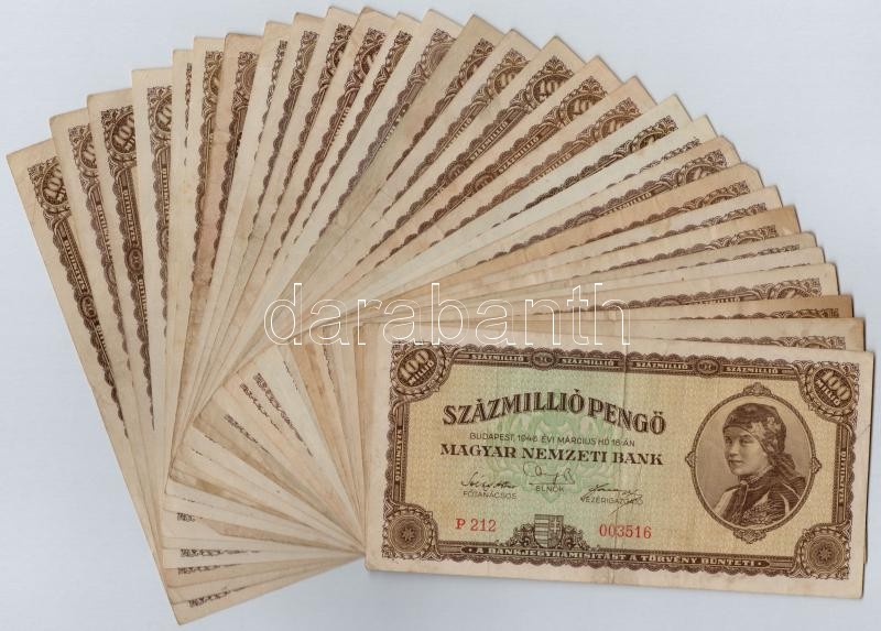 1946. 100.000.000P (30x) T:III,III- https://www.darabanth.com/de/311-Fernauktion/311.0/Numismatik/Ungarische-Banknoten~7/1946-100000000P-30x-TIII-III-~II1703759