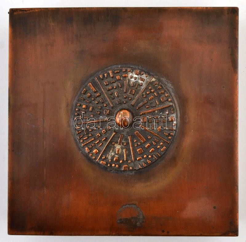 Beschreibung: Kopcsányi Ottó (1933-): Doboz, réz fa betéttel, jelzett, 13,5x13,5x2,5 cm