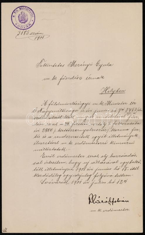 Beschreibung: 1901 Sóvár (Tótsóvár, ma Solivar, Szlovákia), a sóvári magyar királyi erdőhivatal fizetési értesítése Merényi Gyula (?-?) főerdész részére