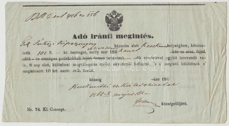 Beschreibung: Kecskemét 1866 Adóintés 15kr okmánybélyeggel
