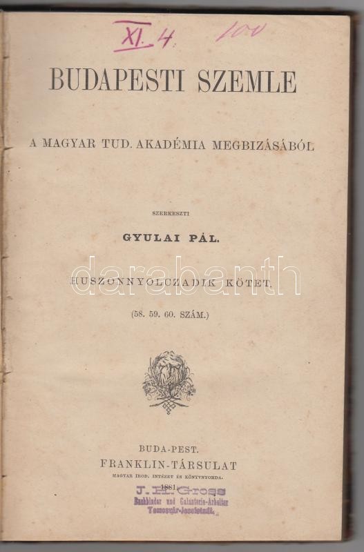 1881 Budapesti Szemle. 28. kötet. (58.,59.,60 szám.) Szerk.: Gyulai Pá... https://www.darabanth.com/de/312-Fernauktion/312.0/Andere-Sammelgebiete/Drucksachen~28/1881-Budapesti-Szemle-28-kotet-58-59-60-szam-Szerk-Gyulai-Pal-Bp-1881-Franklin-Tars~II1706084