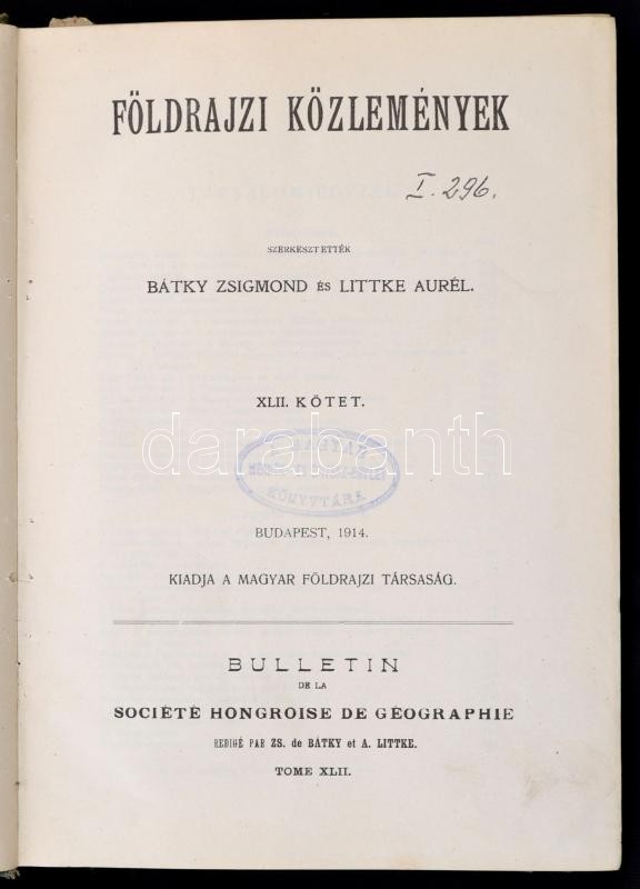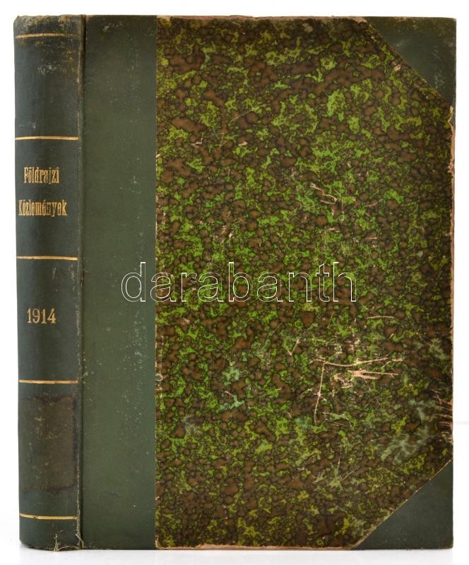 1914 Földrajzi közlemények. XLII. kötet. Szerk.: Bátky Zsigmond, Littke Aurél. Bp.,1914, Magyar Földrajzi Társaság, VIII+452 p.+VI t. (Közte az Északi Hadszíntér kihajtható térképével.) Szövegközti és egészoldalas képekkel, ábrákkal, illusztrációkkal, térképekkel illusztrálva. Átkötött félvászon-kötés, kissé kopottas borítóval, kissé sérült gerinccel, foltos.