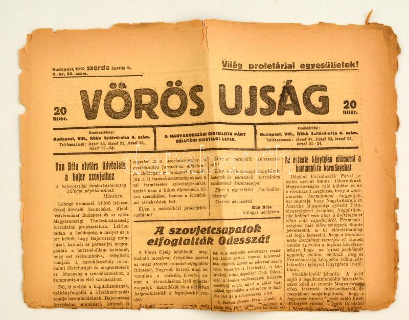 1919 a Vörös Újság április 5-i lapszáma (2. évf. 52. sz.) érdekes aktu... https://www.darabanth.com/de/312-Fernauktion/312.0/Andere-Sammelgebiete/Drucksachen~28/1919-a-Voros-Ujsag-aprilis-5-i-lapszama-2-evf-52-sz-erdekes-aktualis-hirekkel-pl-O~II1710613