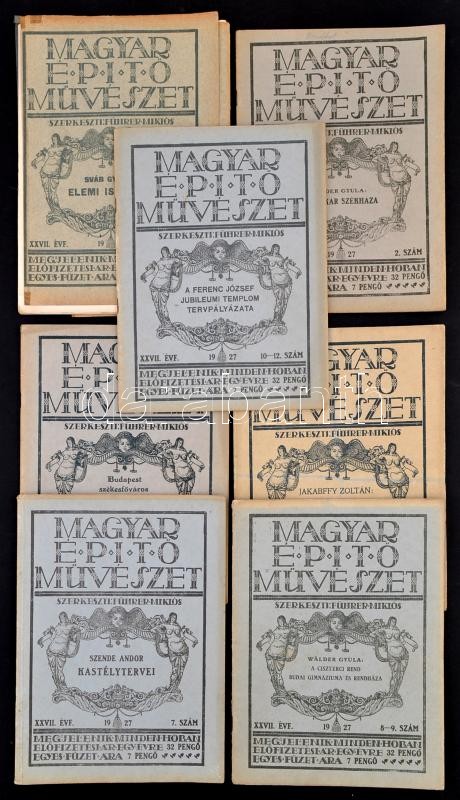 1927 A Magyar Építőművészet évfolyama tematikus számokkal. A Ferenc József jubileumi templom tervpályázata, A ciszterci rend budai főgimnáziuma és rendháza, Szende Andor kastélytervei, A szombathelyi kórház, Budapest székesfőváros kislakásépítkezése, A BESZKÁR székháza, Elemi Iskolák. Összesen 7 db. Egy kivétellel jó állapotban
