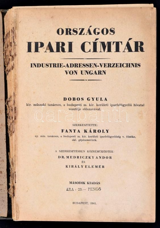 1940 Országos ipari címtá Dobos Gyula előszavával. Szerkesztette Fanta Károly. A szerkesztésben közreműködtek: Dr. Medriczky Andor és Király Elemér.