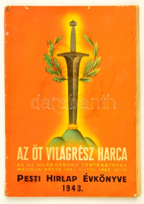 1943 Az öt világrész harca. Az uj világháború történetének második része 1941. XI-től 1942. XI-ig. Pesti Hírlap Évkönyve 1943. Papírkötésben, megviselt állapotban, foltos borítóval, 18-47. és 50-79. oldalak között a lapok kijárnak.
