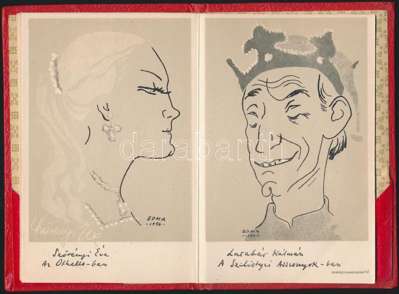 Cca 1950 Edingerné Balázs Márta (EDMA): Színészek Maszkban. Színész karikatúrák 10 darabos kihajtható leporello keménykötésben, benne Major Tamás, Honthy Hanna, Bilicsi Tivadar, Ruttkai Éva, Gobbi Hilda, Gózon Gyula, Szörényi Éva, Latabár Kálmán ,Fenyvesi VIoletta, Maklári Zoltán.