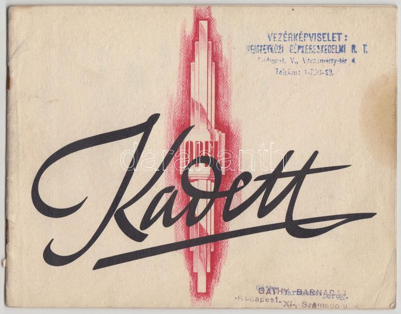 cca 1937-1940 Opel Kadett prospektus, benne szövegközti illusztrációkkal, valamint egy kihajthatóval, az utolsó oldalon technikai adatokkal, német nyelven, a címlapon bélyegzőkkel./