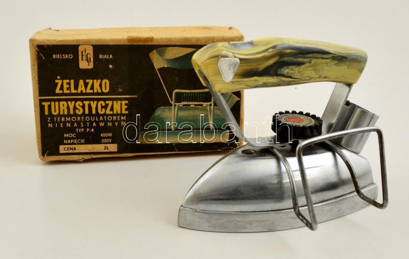 Beschreibung: Régi úti vasaló eredeti dobozában, jó állapotban, h: 15,5 cm